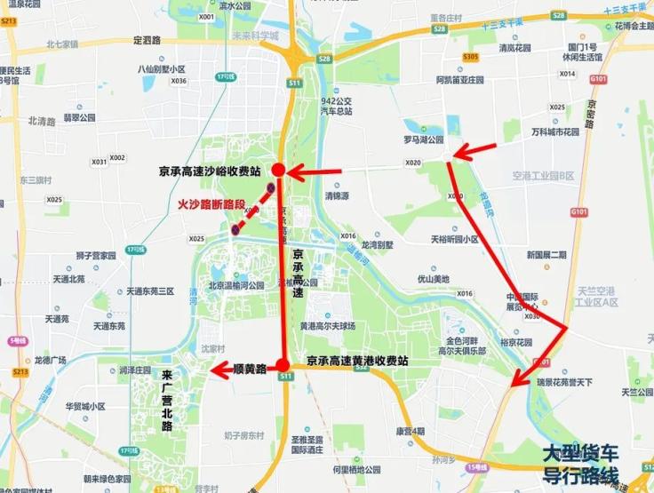 大型货车近端可通过沙峪收费口→京承高速→黄港收费站→顺黄路绕行;远端可通过罗马环岛→天北路→京密路→顺黄路绕行;